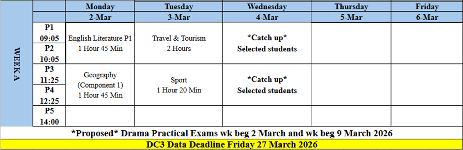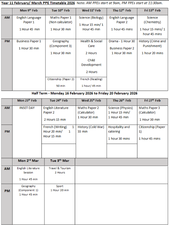 The year 11 PPEs will start on Monday 9th February, continuing until Tuesday 3rd March. Please refer to the below timetable, ensure students are not late for school, and have revised!
